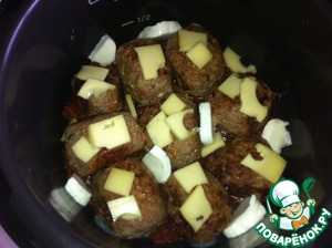 Обжаренные куличики помещаем в кастрюлю (кастрюля должна быть тяжелой), добавляем уже готовый томатный соус, на куличики кладем сыр голландский по кусочку и в саму кастрюлю сыр моцареллу и оставшийся голландский сыр. Закрываем крышкой и тушим 25-30 минут на медленном огне.