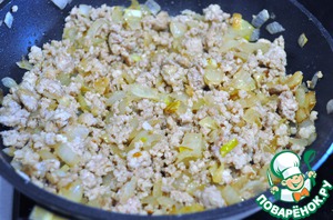 Обжарить лук на растительном масле и выложить фарш, жарить до готовности.