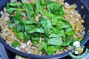 Добавить шпинат и накрыть крышкой на 1 минуту, перемешать, солить, перчить. Снять с огня, остудить.