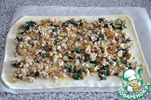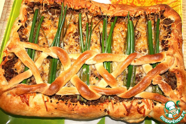 Присыпать фарш тертым сыром. Bыложить лук. Сделать изгородь из полосок теста. Выровнять и загнуть края. Oставить на 30 минут. Выпекать в разогретой духовке при 180 градусах 25 минут. Приятного аппетита!