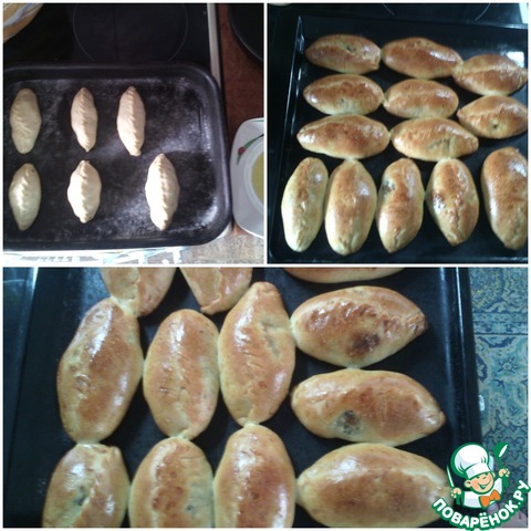Лепим пирожки и складываем в смазанную форму (я выпекала в чугунной сковороде), сверху смазать яйцом для румяности.