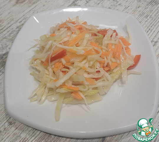 Весной наступает такое время, когда хрустящая зимняя квашеная капуста закончилась или перекисла, а соленые огурцы просто надоели. В магазинах полно помидоров и огурцов, но... Вроде и свежие, и красивые, но какие-то "никакие", словно пластиковые. Этот простой салатик очень нам нравится именно весной. Одна порция кончается, сразу делаю следующую. Хорош в и виде закуски и в качестве гарнира. Салат, конечно, похож на капусту быстрого приготовления, но это не просто капуста с добавками, это салат. Попробуйте и не сердитесь, если этот салат покажется вам банальным, он очень вкусный.