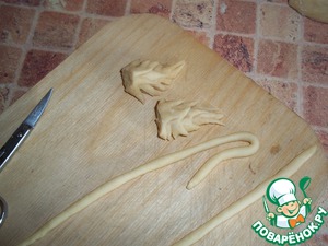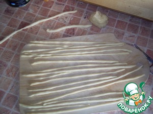 Из теста, для украшения, накатала таких жгутиков (штук 15-20). Жгутики не должны быть слишком толстыми. Чтобы жгутики лучше раскатывались, стол периодически протирала чуть влажной салфеткой.
