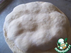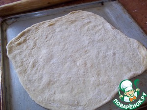 Раскатала пласт теста, толщиной примерно 1 см, уложила на смазанный противень.