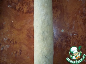 Поделила рулет на одинаковые части и уложила их на пласт теста.