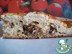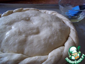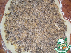 Аналогично раскатала еще один пласт теста и, немного отступив от края, равномерно распределила начинку.