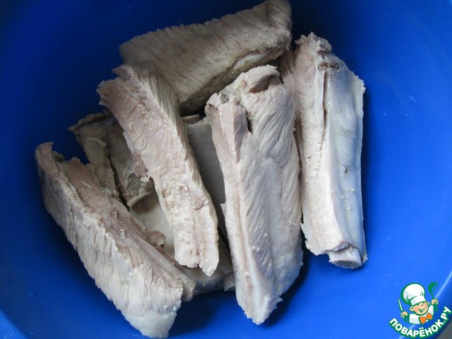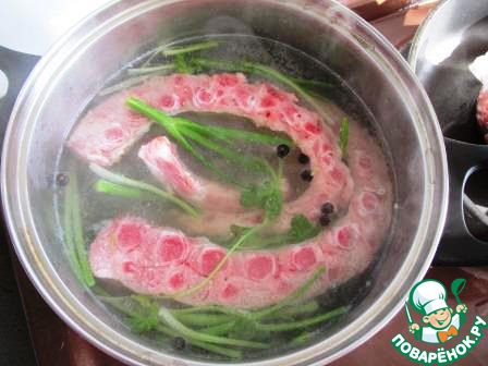 Свиные ребра, не разрезая, промыть холодной водой. Положить в кастрюлю, добавить очищенную целую луковицу, чищеную морковку, 3 стебля сельдерея или пучок стебельков петрушки, лавровый листик. Залить водой. Поставить на огонь, довести до кипения, снять пену, убавить огонь до среднего, всыпать соль и перец горошком и варить, прикрыв крышкой, при небольшом кипении 30 минут.