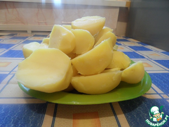 Картофель отварить до полуготовности "в мундире" (именно так в картофеле сохраняется больше всего калия). Чуть-чуть остудить и очистить. Если картошка средняя или крупная, то порезать на половинки.
