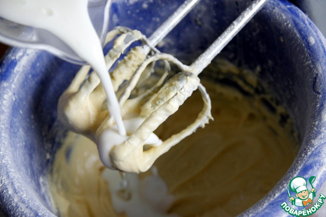 и кефир (или пахту) в яично-масляную смесь. Вымесить до однородности. Это очень быстро происходит!