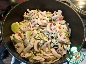 В кастрюле растворить 60 г сливочного масла, добавить овощи, порей и грибы и тушить до размягчения овощей (у меня 15-20 минут).
