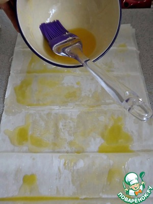 Размягчить сливочное масло в микроволновке или при комнатной температуре, каждый лист фило промазать сливочным маслом. Смазывать надо очень осторожно, так как листы теста тонкие и легко рвутся. Если лист порвался, ничего страшного, можно будет его спрятать под целыми листами. Самый верхний лист также смазываем маслом.