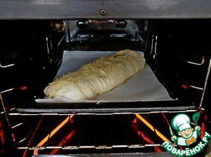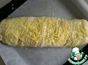 Сворачиваем рулет. Аккуратно переносим его на противень, застеленный пекарской бумагой. Шов у моего рулета внизу. Верх штруделя смазываем сливочным маслом и посыпаем тертым сыром.