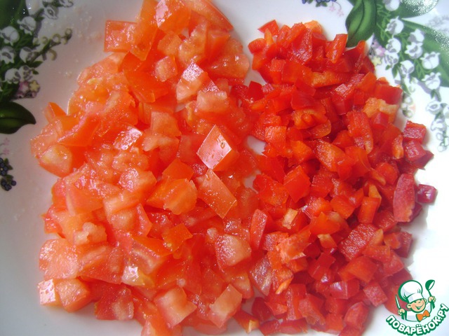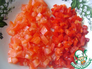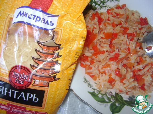 Помидор и перец тушить на оливковом масле до тех пор, пока перец не станет мягким. Добавить к ним рис, черный перец и тушить еще минуты две.