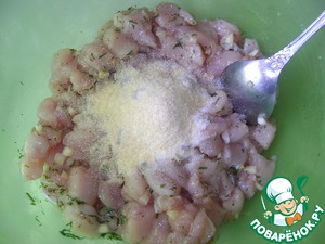 Добавить мелко нарезанный чеснок, паприку сладкую, куркуму, кориандр, базилик, черный перец, зелень укропа, соль.