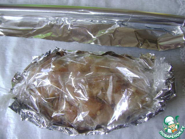 Пакет положить в форму для запекания. Такой формы у меня не нашлось, поэтому я сделала ее из плотной фольги под размер рулета. Запечь рулет в духовке в течение 50 минут при t 200 градусов.