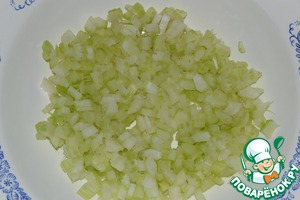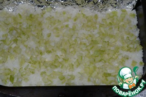 Форму смазать оставшимся сливочным маслом. На дно слоями выложить рис, сельдерей
