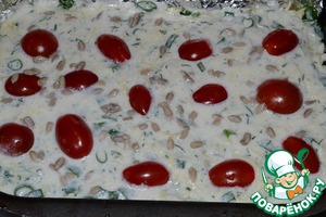 Пирог залить молочно-сырной смесью, украсить помидорами черри, семечками и запечь в предварительно нагретой до 180 градусов духовке 30мин.