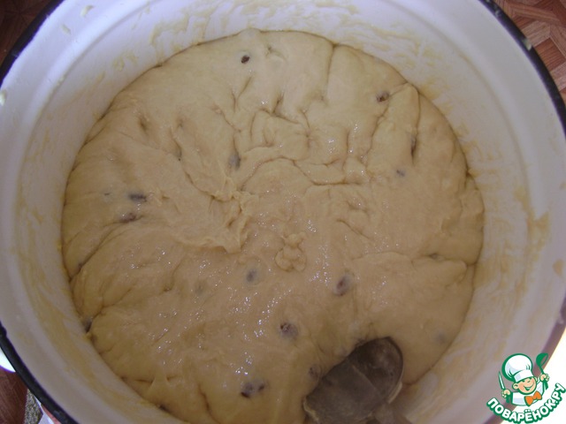 Добавить изюм, хорошо перемешать и поставить в теплое место на 40мин.