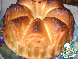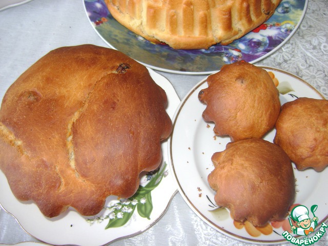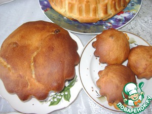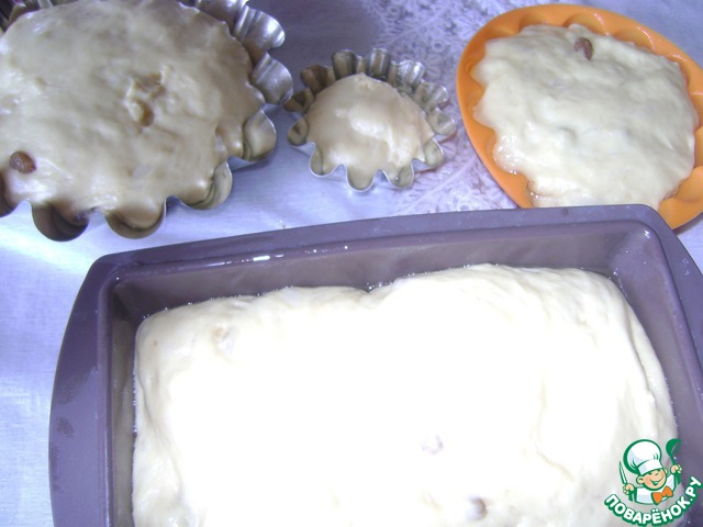 Когда тесто поднялось, разложить в формы, смазанные подсолнечным маслом, и поставить в духовку на 50 минут при 200*С. Форму тестом заполнять не полностью, потому что оно еще поднимется.