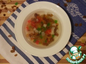 Изюм промываем и вместе с цукатами заливаем горячей водой. Оставляем на 15 минут размокнуть. Что касается цукатов, тут уж дело вкуса. Я выбрала цукаты из кокоса, папайи и ананаса. -