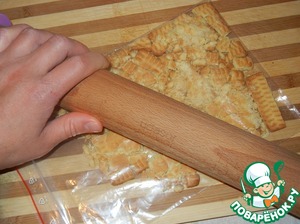 Измельчаем печенье. Можно воспользоваться блендером, я вот таким старым дедовским способом... Пакет и скалка :)