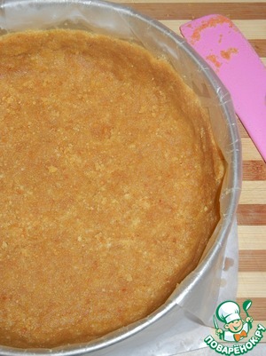 Далее подготовим основу для нашего чизкейка. Разъемную форму (у меня диаметр 21 см) полностью выстилаем пергаментом, и дно, и бока формы. Затем нашу массу из печенья выкладываем на дно и бока формы, прижимая руками и расправляя лопаточкой.