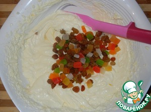 С изюма и цукатов слить воду и обсушить их бумажным полотенцем. В сливочную начинку добавляем изюм, цукаты, сливки (90мл), лимонный сок (1 ст. л.) и аккуратно перемешать с помощью лопаточки