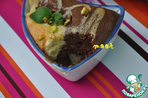 Выкладываем в формочку. С одной стороны груши одно тесто, с другой другое) Ставим в разогретую духовку. Выпекаем 15 мин при 180 С. Украшаем фисташками и мятой.