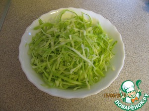 Капусту нашинковать, добавить соль, перемешать руками и помять ее, чтобы стала мягче и пустила сок.