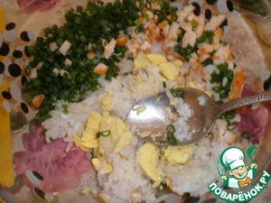 Добавим к рису лук, курицу, яичные желтки. Заправим сметаной, не забудем посолить.