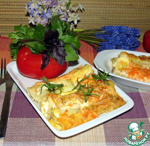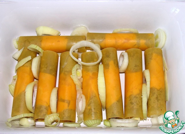 Посуду для запекания взяла побольше. В свободное место между каннеллоне положила кольца лука.