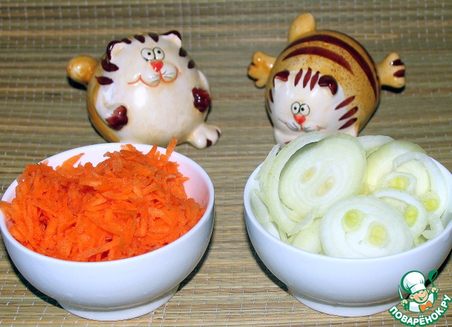 Приготовить тёртую морковь, нарезанный кольцами лук, соль и перец.