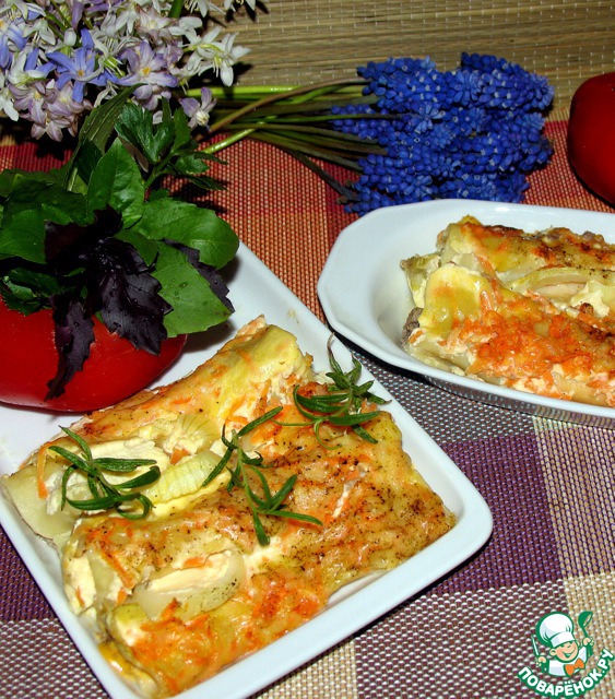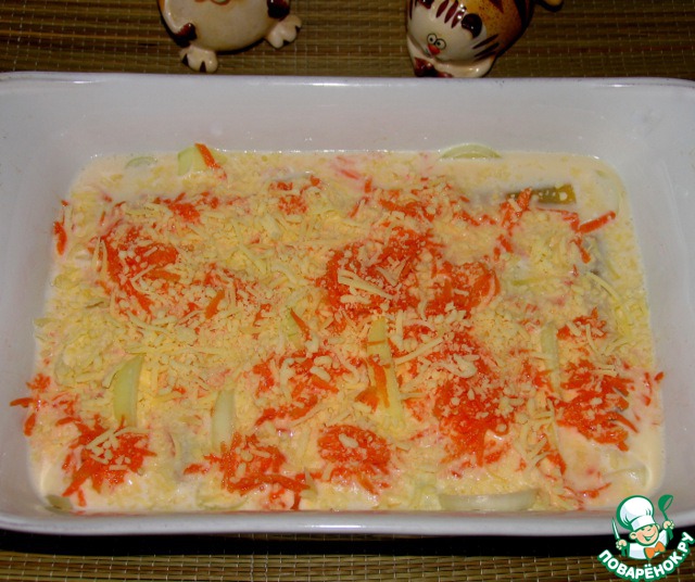 Cверху посыпала тёртой морковью, сыром и поставила в духовку при температуре 200 градусов.