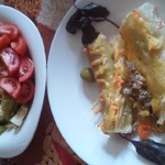 Через 20 минут каннеллоне готово. Подавала с целыми помидорами, маринованными огурчиками и зеленью ( базилик, кориандр, сельдерей и розмарин ). Соус не подавала. Каннелонне получилось достаточно сочное. По две штучки на порцию в самый раз. Самому голодному три...