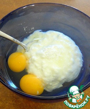 Добавить пекарский порошок, сахар,2 яйца, хорошо перемешать венчиком или вилкой. -