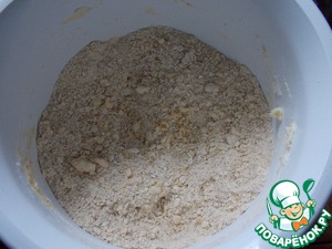 Смешайте обе муки, сахар и разрыхлитель. Если у вас мука не самоподнимающаяся, просто добавьте дополнительно еще 1 ч. л разрыхлителя к норме. У меня все ложки мерные, без горки. Разотрите муку в крошку с холодным маслом. Крошки примерно размером с маленькую горошинку.