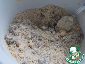 После чего добавьте сухофрукты и овсяные хлопья. Перемешайте, чтобы сухофрукты равномерно распределились по муке.