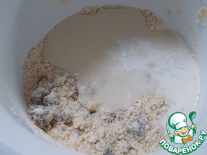 Теперь выливаем сюда нашу закваску и сливки и замешиваем немного липковатое тесто. Месить его не надо! Просто собрать в комок, чтобы кусочки не распадались.