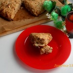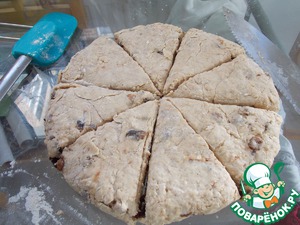 Выкладываем тесто на подпыленный мукой стол и формируем круг толщиной примерно 3 см, просто придавливая и ровняя края руками. Острым ножом разрезаем его на сегменты, выкладываем их на противень, смазываем взбитым яйцом (это по желанию, я в этот раз не смазывала). Ставим в разогретую духовку и выпекаем примерно 20-25 мин до золотистого цвета. (расставивать перед выпечкой их не надо). Важно: чтобы сконы были рассыпчатыми, температура духовки должна быть 200-210С (в моей духовке это газ 6).