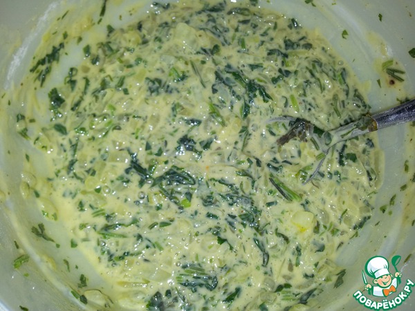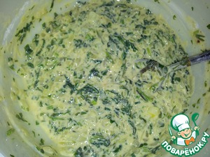 • В размороженную зелень с луком добавляю яйцо, специи, муку и замешиваю тесто.