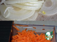 Пока готовится тесто, делаем начинку: лук режем полукольцами, морковь трем на крупной терке.