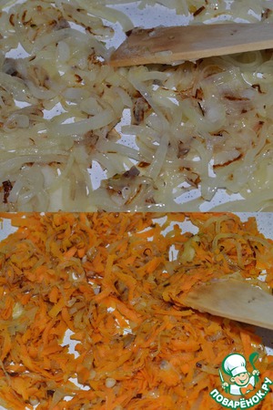Раскалить масло и обжарить лук до золотистого цвета, затем добавить морковь и жарить до мягкости последней, постоянно помешивая.
