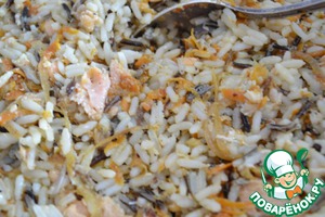 Из рыбной консервы слить жидкость. Перемешать сваренный рис, обжаренные лук и морковь и рыбу. Хорошо поперчить и при необходимости досолить.