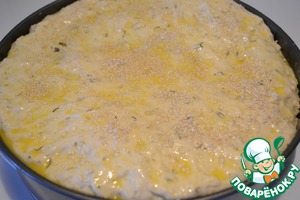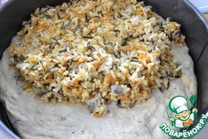 Разделить тест на 2 равные части. Одну часть выложить в смазанную маслом форму (у меня диаметр 28 см), сверху выложить всю начинку. Хорошо "утрамбовать" нашу начинку, как бы вдавливая в тесто.