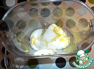 Масло (комнатной температуры!)+ 0,5 стакана сахара, взбить. -