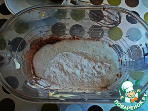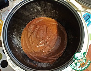 Нам нужно 2 коржа- тесто на жидкой стадии делим пополам и выпекаем или печем 1 большой корж, и разрезаем. Лично я разделила на 2 части и выпекала в своей мультиварочке, на один корж 35-40 мин. -