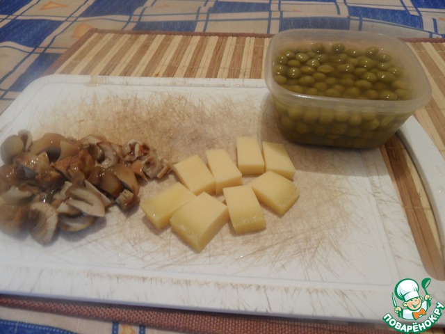 Для сюрприза берем все, что есть в холодильнике. Зелень, перец болгарский, кукуруза, зеленый горошек, сыр, паштет, яйцо варенное. У меня сегодня был сыр, зеленый горошек и соленые грибы. Все режем на маленькие кусочки.