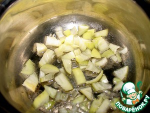 В кастрюлю в которой будем варить суп налить масло. Нарезать лук и минут пять обжарить в масле.