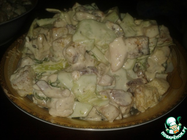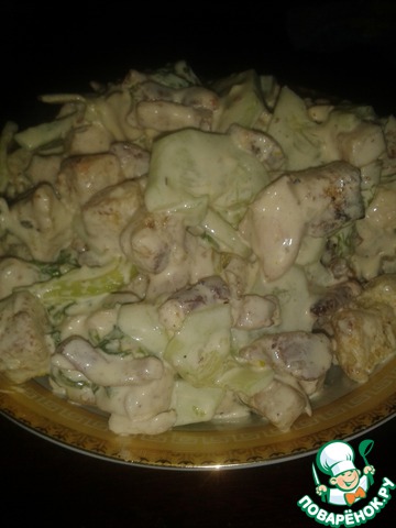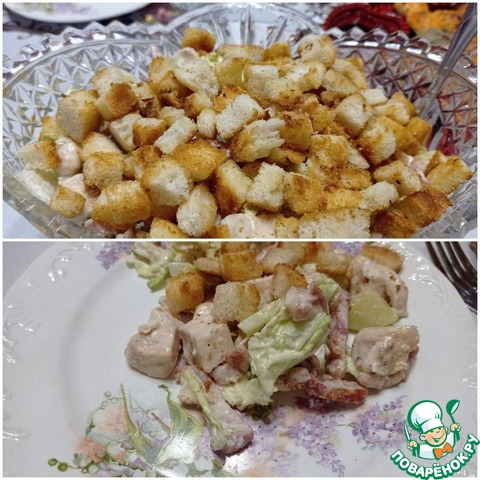 Все остальные ингредиенты смешать (бекон, курицу и перед подачей на стол добавить гренки из батона). Добавить соль, перец и, если надо, добавить майонез.