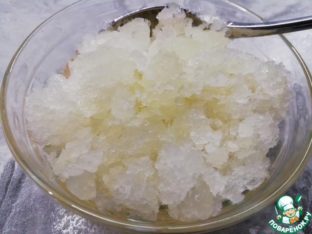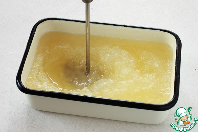 Перелить сок с сахаром и водой в лоток и убрать в морозилку минимум на 3 часа. Каждые полчаса лоток доставать и разминать содержимое вилкой или толкушкой для картофеля, чтобы избежать появления крупных кристаллов льда. Тогда ваша будущая гранита не превратится в кубик льда, а будет нежной и тающей во рту.